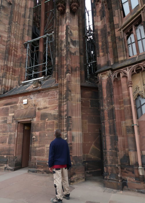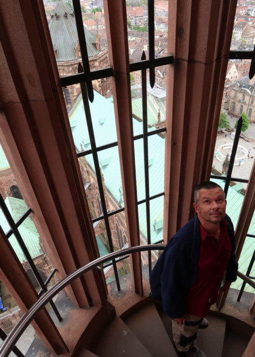 Aujourd’hui, Mathieu Baud travaille au contact de la matière à la conservation et à la restauration, pour préserver un maximum de matériaux existants, il faut « sauver un maximum plutôt que juste remplacer« . Avec lui, nous faisons l’ascension de la cathédrale, par le circuit que le public peut emprunter. Pendant les quelques 300 marches, il vous explique des détails d’architecture, les pierres, le choix du grès qui a évolué au fi des restaurations, les étapes de restauration sur les marches des escaliers, etc. Nous grimpons jusqu’à la plateforme à 66 mètres, où se situe notamment l’ancienne maison des gardiens. Vous apprendrez notamment qu’il existe des petits escaliers invisibles depuis le bas de l’édifice mais qui permettent d’atteindre jusqu’à la flèche à 142 mètres, car « tout doit être accessible dans une cathédrale pour pouvoir l’entretenir« .