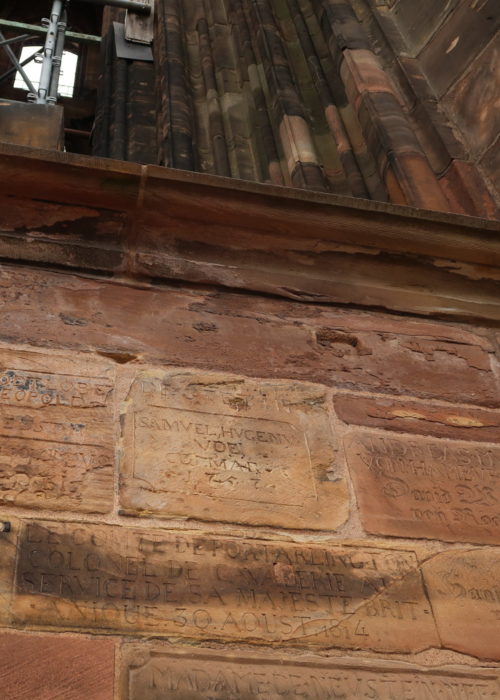 La cathédrale de Strasbourg n’était pas qu’un édifice religieux mais servait à la vie quotidienne. Ainsi, ces murs pouvaient servir de panneau d’affichage à destination des Strasbourgeois, activité dont elle conserve des traces discrètes mais très intéressantes. Sur le côté sud, on peut encore voir aujourd’hui la trace de l’encorbellement à respecter pour les constructions pour éviter la propagation trop rapide des incendies lors des départs de feux.